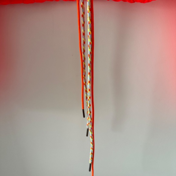 Very bright orange/pink cropped jacket in slightly shiny fabric. Shoelace type detail. Never worn. Fits like a cropped bomber