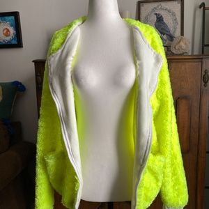Awesome handmade vintage fluorescent faux fur zip up bomber jacket. Unlined, with white elastic cuffs and elasticized bottom. This jacket is a true highlighter yellow! I usually wear a size 6 in tops and this fits comfortably and flatteringly oversized.