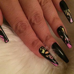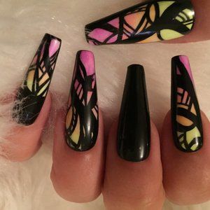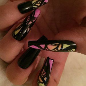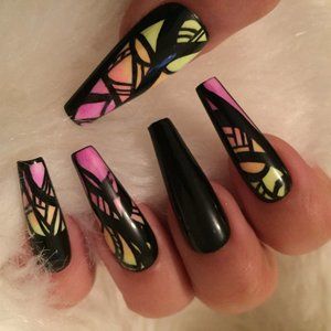 Neon yellow/orange n pink tribal press on nails Can be used with sticky pads for short time wear. Or glue on for up to two week hold . For best results,