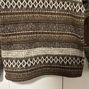 Has nice suede looking patches on the elbows and a vintage brown printed look - nice fold at the neck and a button up front