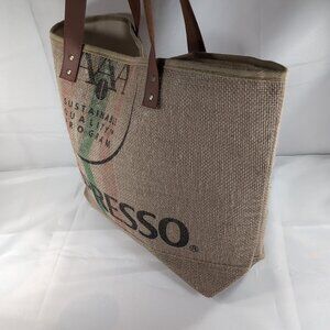 Nespresso Tote Bag Jute Burlap Beige Brown Faux Leather Shoulder 19x14" Coffee