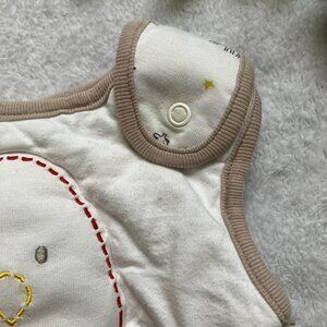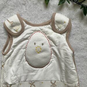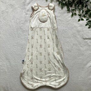 Nested Bean Zen Sack Premier in size 6-15 months, giraffe print with classic embroidered chick on chest. Bamboo cotton blend for softness and breathability. Lightly weighted to help soothe baby at sleep time.