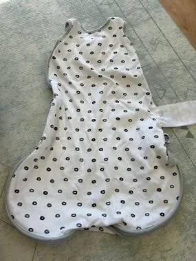 Soft white baby sleep sack with gray trim and black dot pattern. Cute embroidered face detail on chest. Lightweight and cozy for swaddling. Simple, gender-neutral design.