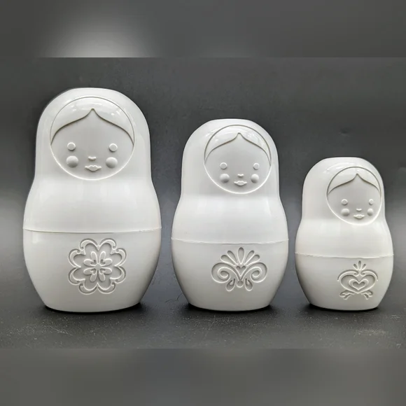 Very nice 3 Piece White Plastic Nesting Dolls. The largest measures 5" Tall x 3.25" in diameter. In great condition with no cracks or damage.