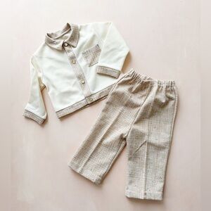 An adorable 2 piece baby set. A collared button front top, cream with tan & speckle trim, including a breast pocket. The matching pants made from the speckled trim fabric have an elastic waist.