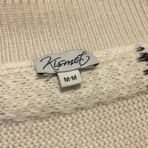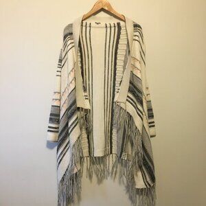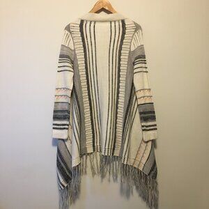 Very good preowned condition, knit bohemian tasselled handkerchief cardigan shawl, with Arizona/Apache-inspired geometric pattern in pale pink, grey, black and cream by Kismet. Perfect layering garment for any season.