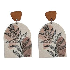 These modern earrings feature a curved arch design with delicate black leaf illustrations over soft blush and beige tones. Crafted from lightweight wood with a rich brown topper, they blend natural beauty with contemporary flair.