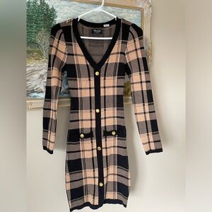 Stylish plaid dress featuring a classic black and tan design. Perfect for any occasion with its elegant long sleeves and button details. NWOT SIZE MEDIUM