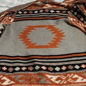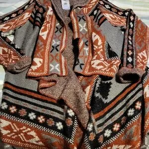 Stylish super cozy open front, flowy cardigan with geometric patterns. Features orange, black, and gray colors.