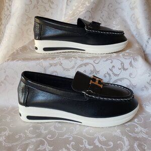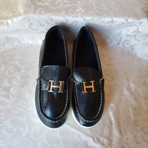 Never worn, Like New. H monogram Boat Shoes. Black with Gold H