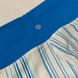 Cropped Lululemon leggings; white and blue colourway with bold stripe accents. Perfect for your next workout, yoga session, or just relaxing in style.