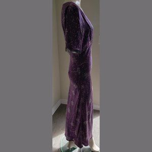 One of a kind stunning 100% silk dress. Beautiful shade of purple w/ delicate floral pattern. I've had this dress for 30 years & it's never been worn. I love it & selling it is breaking my heart a little! V-neck wrap style at bust W/ empire waist. Sleeves have beautiful multi-coloured, iridescent beads. Slight flare at hemline.