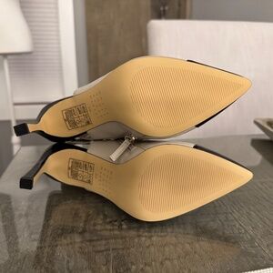 Brand new, never worn — my loss is your gain! These chic ankle booties from White House Black Market feature a sleek pointed toe, contrasting black cap-toe against the creamy upper, a side zip for easy on/off, and a bold chain trim around the ankle for a stylish edge. The stiletto heel gives them an elegant silhouette — perfect for dressy evenings or elevating a tailored daytime look.