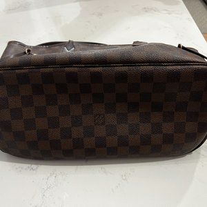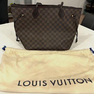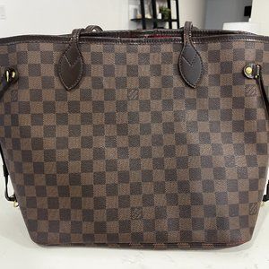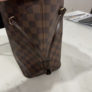 Preloved authentic Louis Vuitton Neverfull MM Damier Ebene with dust bag included. I got this bag second hand a few years ago and I just don't get enough use out of it anymore. It has some signs of wear around the top trim which are clearly seen in the photos - priced accordingly. The outer canvas and inside is in good condition and clean. I replaced one of the side straps through LV in June of 2023 (see the last photo). I have a video too but it didn't let me upload it so just ask and I can send it to you.