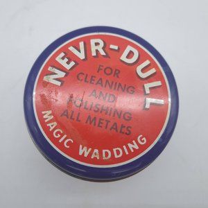 A vintage tin of Nevr-Dull magic wadding polish with the copyright date of 1941 made by The George Basch Co. in the US. The tin is a 5 ounce/142 gram size and is in good condition with just a few nicks and scratches. There is some of the wadding left inside the tin.