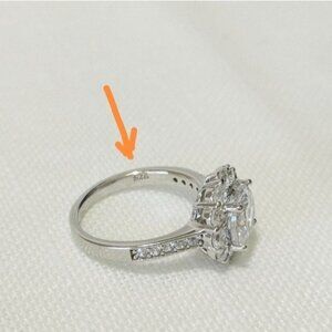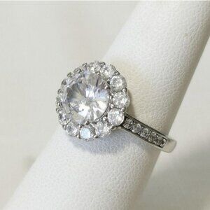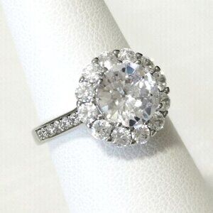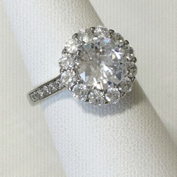 A stunning ring of a central 3ct CZ, surrounded by a halo of smaller stones in a flower design.
