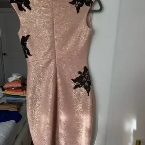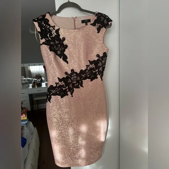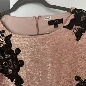 Elegant pink dress with black lace detailing. Perfect for any occasion.