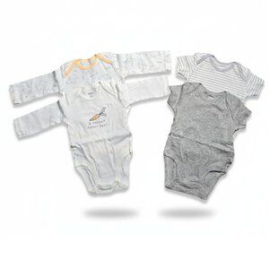 Adorable and essential 6-piece baby outfit set perfect for everyday wear! This newborn starter collection features a sweet carrot and bunny/animal theme in versatile gender-neutral gray, white, and yellow accents. All pieces are designed to be mixed and matched.