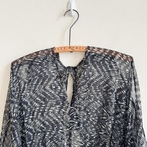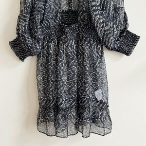 Sheer elasticized minidress with an eye-catching metallic shimmer and breezy back tie detail.