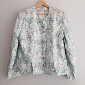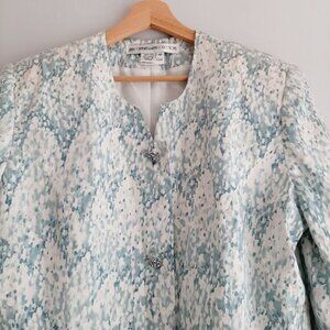 • Long sleeve button down blazer in white and blue abstract watercolor design silk fabric.