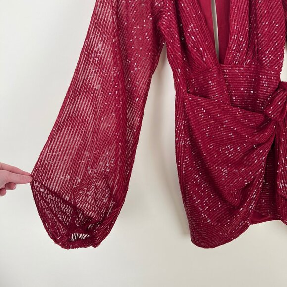 Features: Deep plunge front V-neck, long semi-sheer balloon sleeves, cut out keyhole back, asymmetric skirt design, tie waist, all-over sequin design