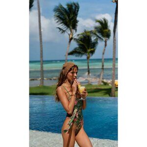 Introducing the Hutch Zenna One-Piece swimsuit, a stunning addition to your swimwear collection. This one-piece features a beautiful green floral pattern and is designed with adjustable shoulder straps, gold-tone hardware, ruched sides, a self-tie waist sash, and removable soft cups for customizable comfort and support. The slip-on styling makes this swimsuit easy to put on and take off, while the moderate seat coverage ensures you feel confident and comfortable.