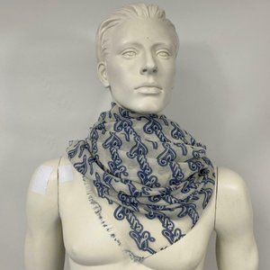 This white cashmere silk blend Louis Vuitton scarf features an all over navy Louis V with some multi-color Louis V. prints throughout.