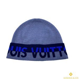 This gray Louis Vuitton hat is composed of 100% wool and feature Louis Vuitton printed in large two tone letters.