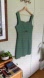 This dress is a stylish, structured mini dress in a muted sage green. It features wide shoulder straps and a square neckline, which give it a clean, modern silhouette. The standout design detail is the small triangular cutout just below the bust, adding a subtle touch of interest and edge without compromising its overall simplicity. The dress is fully lined, providing shape and structure.