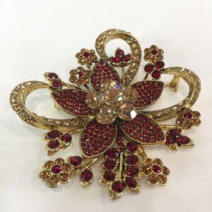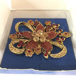 New Avon 35 Yrs 2006 Red Rhinestone Large Statement Flower Brooch Pin Gold Tone