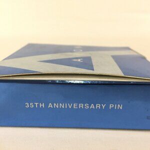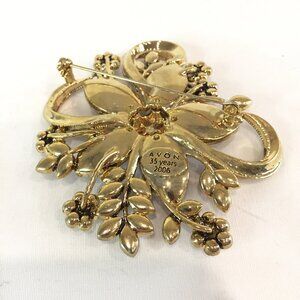 This is a new never worn red, brown and gold tone brooch. It is an Avon 35 year anniversary pin from 2006. It measures approx. 3 inches across. It is the original box. The box is open and has some wear.