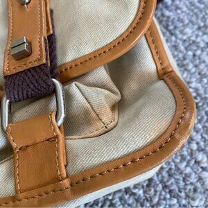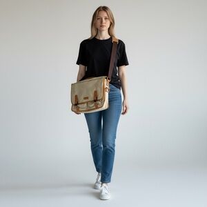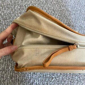 The fabric is described as a waxed canvas. There are so many pockets! Front zip on outside, 2 medium and a big horizontal on outside once main flap is open, zippered on inside and space with Velcro flap for laptop or iPad. Back pocket that buttons shut. Zipper around bottom for expansion. All wear is shown in pics. Feel free to ask for more pics or info. This is a very versatile bag by a very reputable brand. Measures approx 14.5” wide, 10” tall, 4.5” deep without expander zipper open.