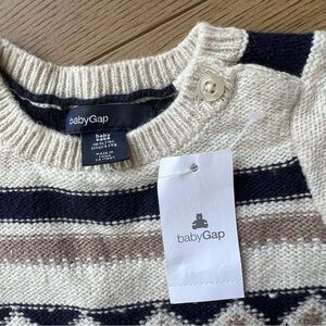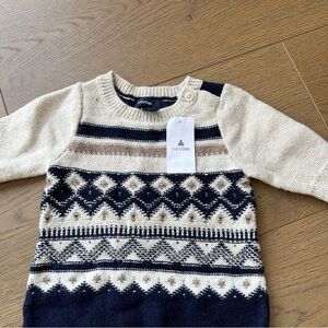 Adorable baby romper with Fair Isle pattern. Features cream and navy colors.