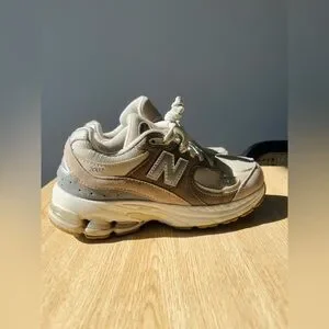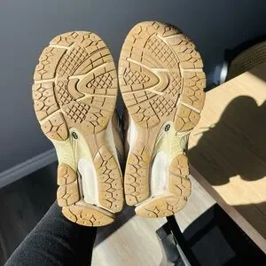 Comfortable New Balance sneakers. Features a stylish gray and brown design.