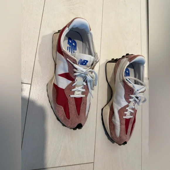 Dynamic New Balance 327 shoes in burgundy, pink and white. Ideal for active lifestyles.