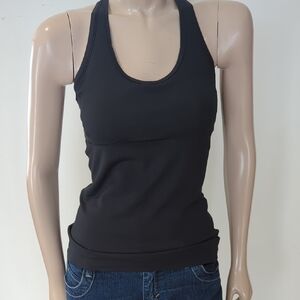 This fitted black tank top features a classic scoop neckline and racerback design, providing a comfortable and stylish fit. Made from stretchy material, it hugs the body's contours and is perfect for workouts or casual wear.