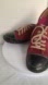 Wine - Red, Suede Leather. Black toe cap. Running Shoe with a fun pattern lining, taupe laces and black shell toe. These skater shoes were made popular in the 80’s and 90’s.