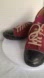 Wine - Red, Suede Leather. Black toe cap. Running Shoe with a fun pattern lining, taupe laces and black shell toe. These skater shoes were made popular in the 80’s and 90’s.