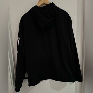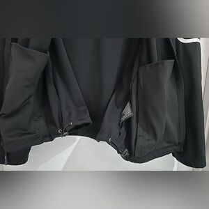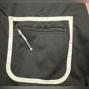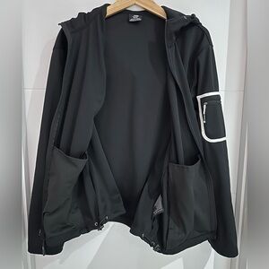 Men’s Light Jacket- Size Medium. Lightly used with minor visible wear & fading in areas throughout. Zipper tab has some damage on the end (photo # 3) Features zip pockets and arm pocket for convenience (photo #5) White accent around the arm pocket has some wear as well that can be viewed in photo #5. Made of 100% Polyester.
