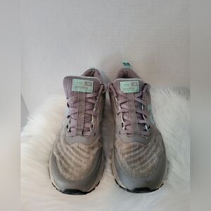 Stylish New Balance sneakers in tan with teal accents. Perfect for casual wear.