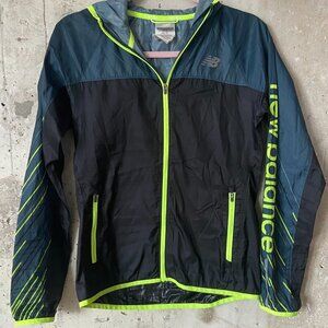 Reflective areas. Hooded. Super light. Jacket could fit into a waist belt/fanny pack.