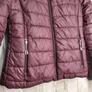 Stylish burgundy puffer jacket. Features zippered pockets and New Balance logo. Perfect for cold weather.