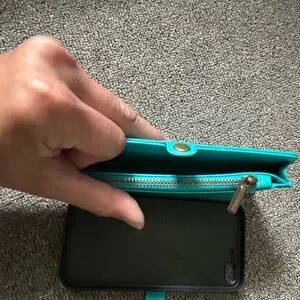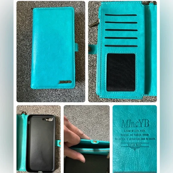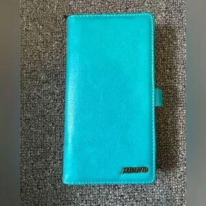 New. Never used phone wallet is a beautiful turquoise color. Measurements for phone are 15.5cmx7.5cm.