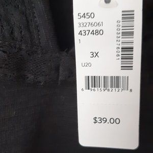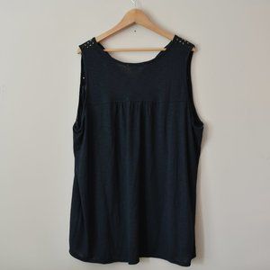 Black, sleeveless blouse with lace detailing.