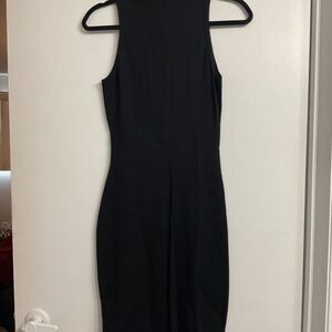 Black mock neck fitted / bodycon dress, thick material / not see through. Length is around mid-calf.