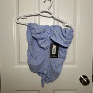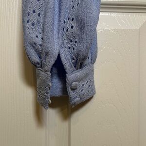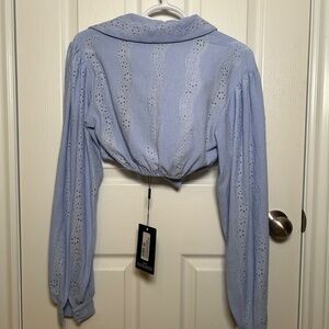 Brand new / never worn blue skirt set, shirt is long sleeved and cropped, skirt is above knee - mid thigh length. Comes with both top and bottom / selling as a set