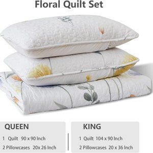 New Blue & Yellow Floral 3-Piece 100% Polyester Quilt Set • Reversible • KING