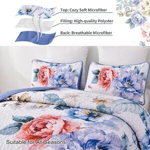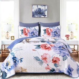 New Botanical Blue Floral 3 PC Bedding 100% Polyester Quilt Set • QUEEN Size