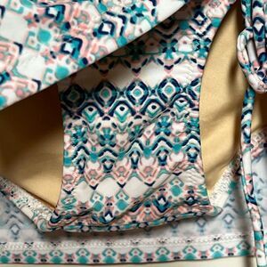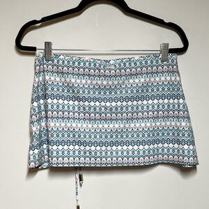 Includes Top Sz S, full coverage bikini bottom Sz S and ruched skirt which has bottoms underneath so is functional as swimwear as well. Skirt is size M