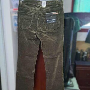 Calvin Klein corduroy pants in an army green shade, size 6 styled with a medium rise waist and designed with patch pockets and bootcut style. Classic corduroy pants blended with stretch for a flexible fit that moves with you. Features a 5-pocket design with a button and zipper closure. Ideal for winter, fall, and spring seasons. Machine washable for easy care. This item is brand new and has never been worn. It still has the original tags